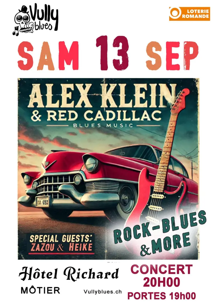 Alex Klein, c’est avant tout une voix marquante de la scène suisse. Et un guitariste de talent avec près de 50 ans d’expérience de scène, passionné par le blues, le chicken picking, et tout ce qui porte le sceau du twang. Avec son répertoire traditionnel et son authenticité musicale, ce Fribourgeois d’adoption se produit dans toute la Suisse, en Europe, et aux États-Unis (notamment à Nashville, La Nouvelle-Orléans et au Texas). Auteur-compositeur, il a produit quatre albums et quatre singles à Nashville (Tennessee), ville avec laquelle il a tissé, au fil des ans, une véritable histoire d’amour musicale. Soutenu par les excellents Cédric Gander à la batterie et Peter Kalkix à la basse, le répertoire de sa formation Red Cadillac nous promet un rock-blues puissant dans l’esprit des power-trios des années 60.